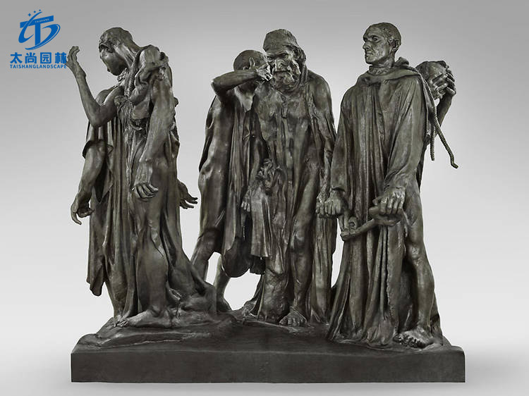雖然大多數(shù)人把法國偉大的雕塑家奧古斯特·羅丹與思想家聯(lián)系在一起,但這個(gè)紀(jì)念英法百年戰(zhàn)爭(zhēng)(1337-1453)中一個(gè)事件的合奏在雕塑史上更為重要。受委托在加萊市的一個(gè)公園(1346年,英國人在那里解除了長達(dá)一年的圍攻,當(dāng)時(shí)有六位鎮(zhèn)上的長老為了保護(hù)人口而獻(xiàn)身行刑),市民們避開了當(dāng)時(shí)紀(jì)念碑的典型樣式,羅丹沒有把人物孤立起來,也沒有把他們堆在高高的基座上的金字塔里把他真人大小的物件直接放在地上,與觀眾平起平坐。這種走向現(xiàn)實(shí)主義的激進(jìn)舉動(dòng)打破了通常給予這種戶外作品的英雄待遇。羅丹和市民們一起向現(xiàn)代雕塑邁出了第一步。